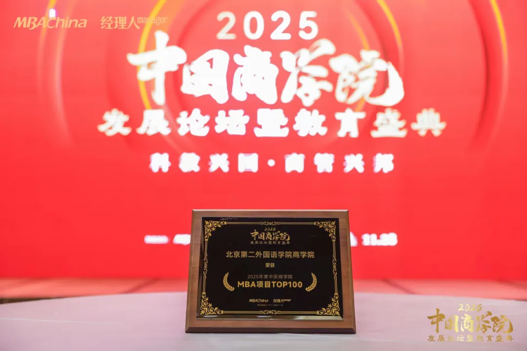 为致敬在商科教育领域坚守育人初心、锐意创新前行并持续发挥引领示范作用的卓越力量,盛典以榜样之力推动行业进步与价值共振。会议现场隆重揭晓并颁发“2025年度中国商学院MBA项目系列重磅榜单”,包括主榜单、子榜单及个人奖项。在发布的年度重磅榜单中,北二外商学院MBA项目表现亮眼,入选 “2025年度中国商学院MBA项目TOP100” 主榜单。该榜单基于对项目师资、人才培养、课程体系、学科融合与品牌影响力等核心维度的综合评估,旨在遴选出年度最具实力的MBA项目。同时,北二外商学院MBA项目以其独特的办学定位与卓有成效的实践,荣获 “‘外语+国际化’特色MBA项目奖” ,彰显了北二外商学院MBA项目在跨文化管理人才培养领域的领先优势与独特价值。